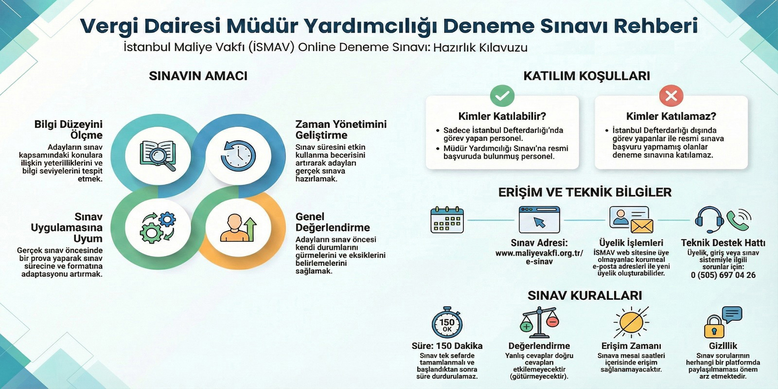 Deneme sınavına sadece İstanbul Defterdarlığında görevli olup müdür yardımcılığı sınavına giriş için Gelir İdaresi Başkanlığına başvuru yapanlar girecek olup İstanbul Defterdarlığı dışında çalışanlar ve sınava başvuru yapmayanlar sınava giremeyeceklerdir. Deneme sınavına 28.03.2026 tarihine kadar www.maliyevakfi.org.tr/e-sinav adresi üzerinden girilebilecektir. İSMAV web sitesine üye olmayan Defterdarlık personelleri kurum e-posta adresleri ile üye olabilirler. Üyelik, kullanıcı girişi veya sınav sisteminde sorun yaşayan kullanıcılar 0 505 697 04 26 numaralı telefondan yardım alabilirler.